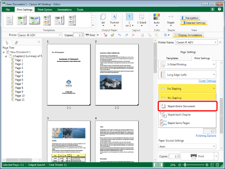 Select [Staple Entire Document] in [Detailed Settings for Printing] on the [Print Settings] tab on the Details Window.