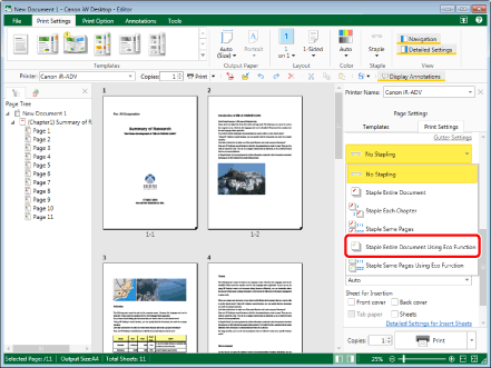 If you do not want to use Eco (Staple-Free), select [No Stapling] on the [Print Settings] tab on the Details Window, the ribbon command, or the tool button.