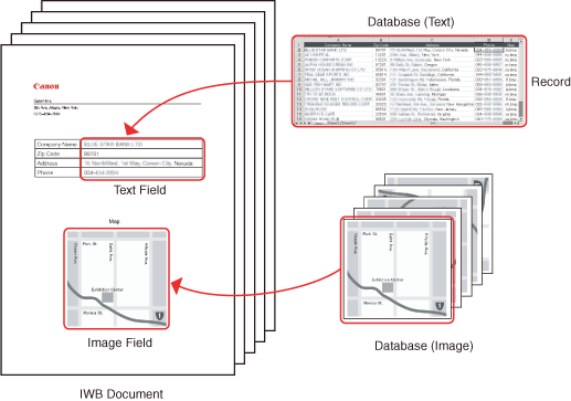 Replaceable data is called a "record", and can use data from places such as address books and databases.