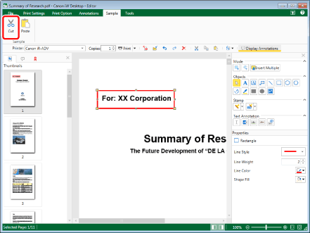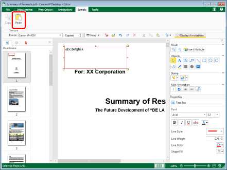 If you perform the paste operation when the annotation to be copied/cut is deselected, the copied/cut text string is pasted as a