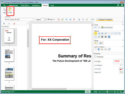 When the same page is specified as the paste destination of the copied annotation, the annotation is pasted 15 pixels below and to the right of the copy source.