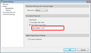 This section describes how to change the user name of the annotation (set during insertion) in [System Settings].