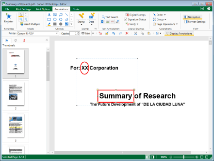 If the place clicked is a text editing area, the annotation is selected and you become able to enter text.