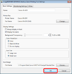Change the settings as required in the [imageRUNNER ADVANCE Desktop Quick Printing Tool Settings] dialog box, and click [OK].