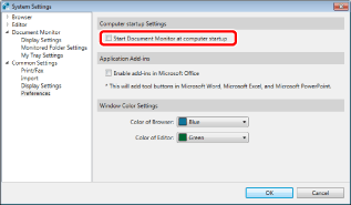 [File] menu > [Option] > [System Settings] > [Common Settings] > [Preferences] > [Start Document Monitor at computer startup]