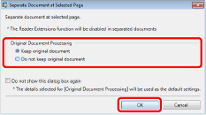 If this item is selected, the next time a document is divided the [Separate Document at Selected Page] dialog box is not displayed. The settings in [Original Document Processing] are used as the default values when this item is selected.