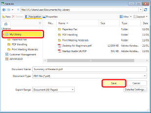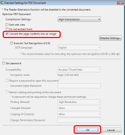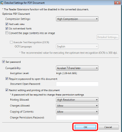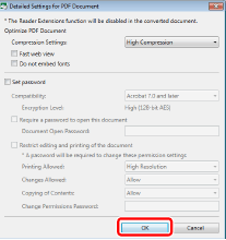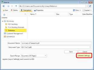 If you select [Set Details and Convert to PDF Document], the [Detailed Settings for PDF Document] dialog box is displayed. For more information on the [Detailed Settings for PDF Document] dialog box, see the following.