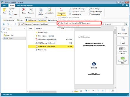 (Conversion) on the ribbon, and select [Set Details and Convert to PDF Document].