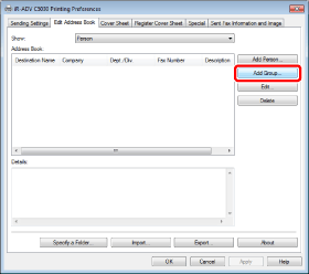 If you are using the Canon Generic FAX Driver, click [Edit Address Book] on the [Select Destination] tab, and click [Add Group] on the [Edit Address Book] dialog box that is displayed.