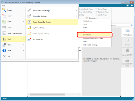 Select the [File] menu > [Tools] > [Create Output Bar Button] > [Application].