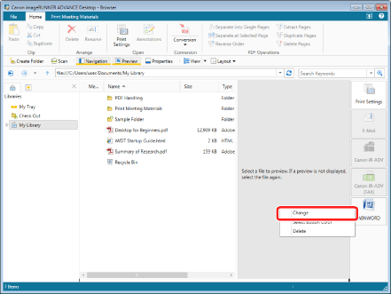 for the application output button displayed on the ribbon or toolbar and selecting [Change]. If an output button is not displayed on the ribbon or toolbar, see the following to display one. |