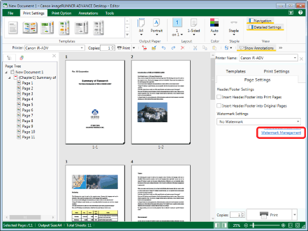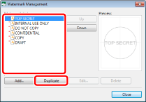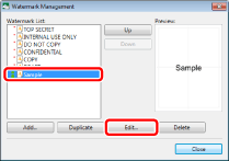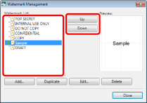 The [Watermark Management] dialog box displayed by clicking [Watermark Management] on the [Page Settings] tab on the Details Window