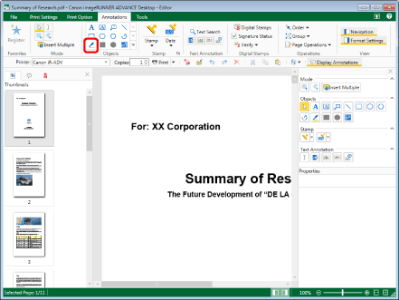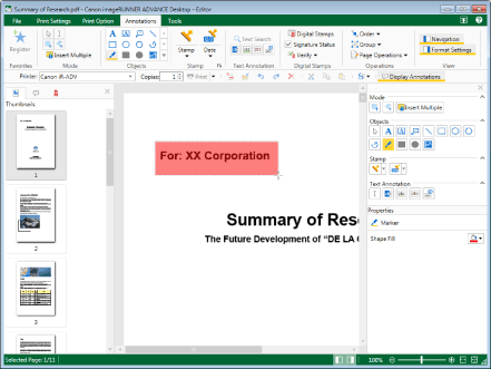 Because markers are drawn semitransparent, even if a marker is placed in front, other inserted annotations and the document behind it remains visible.