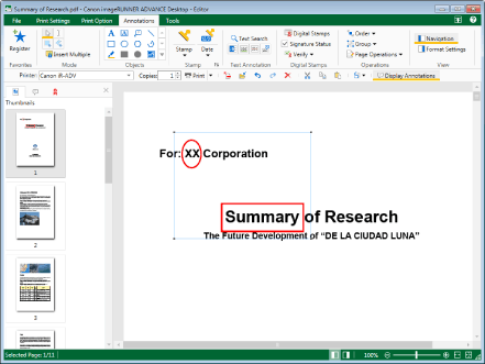 If the place clicked is a text editing area, the annotation is selected and you become able to enter text.
