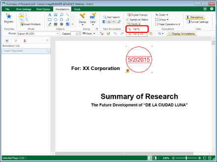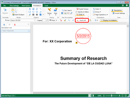 Select the digital stamp to verify in the [Signature List] tab on the Navigation Window.