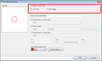 When [Text] is selected, you can register stamped images that use an enclosing circle, the specified text and date.