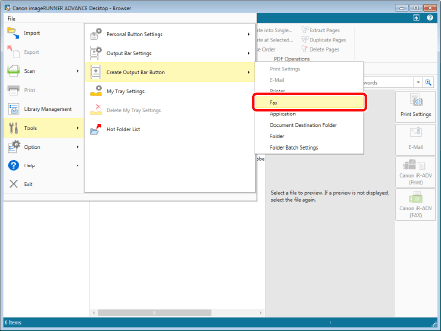 Select the [File] menu > [Tools] > [Create Output Bar Button] > [Fax].