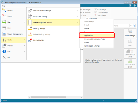 Select the [File] menu > [Tools] > [Create Output Bar Button] > [Application].