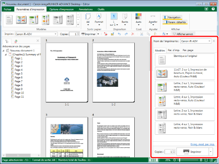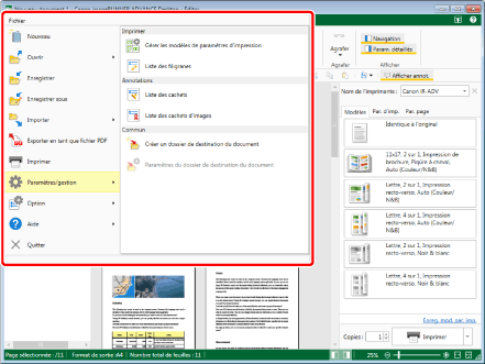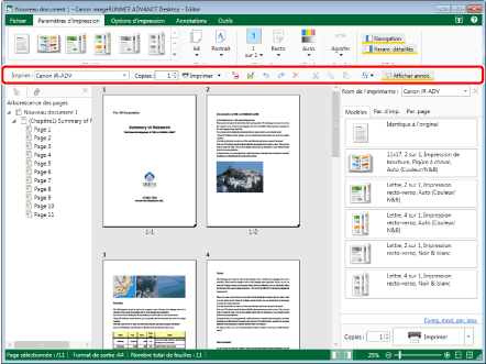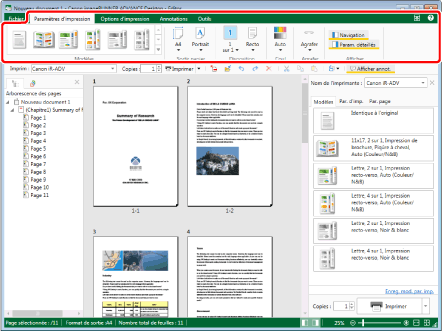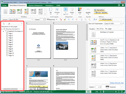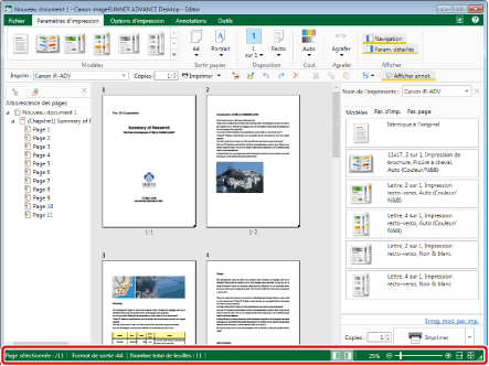 La barre d'état affiche le nombre total de pages du document, le numéro de la page actuellement sélectionnée, les formats de papier en sortie, ainsi que le nombre de feuilles à imprimer. Elle permet par ailleurs d'effectuer les opérations suivantes :