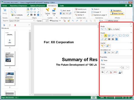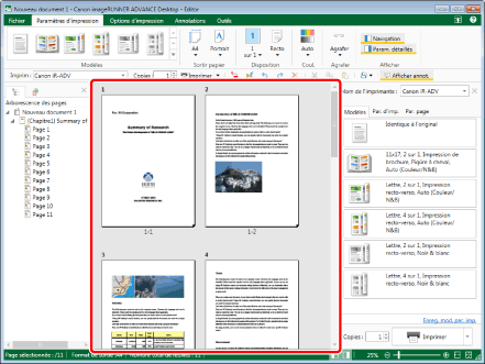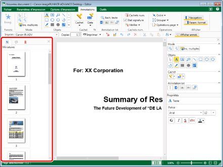 Onglet [Miniatures] : affiche les miniatures de pages du document. Il est possible de sélectionner les pages à afficher ou modifier en cliquant sur les miniatures correspondantes.