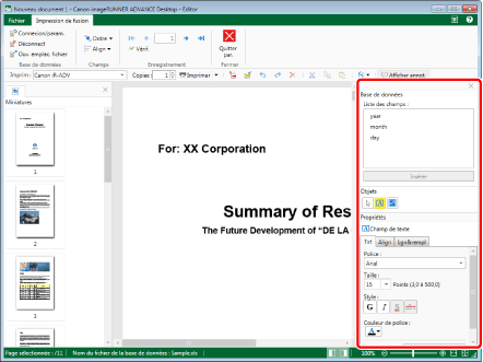 La Fenêtre Détails affiche la liste des enregistrements lus et les propriétés du champ de publipostage.