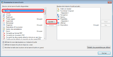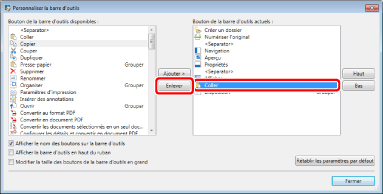 Si l'on clique sur [Ajouter] après avoir sélectionné un bouton dans [Bouton de la barre d'outils actuels], le bouton sélectionné dans [Bouton de la barre d'outils disponibles] est ajouté sous le bouton sélectionné.