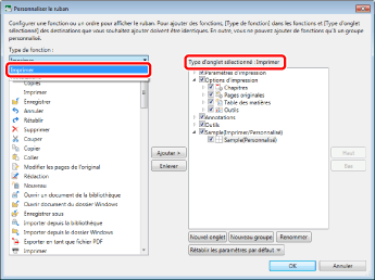 Pour plus d'informations sur les commandes/groupes pouvant être ajoutés au ruban, consulter la section suivante :