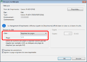 En cas de changement de pilote à utiliser, si un pilote d'imprimante est remplacé par un pilote de télécopieur, l'option [Imprimer] devient automatiquement [Envoyer une télécopie].