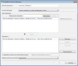 Si l'une des opérations suivantes est effectuée, la boîte de dialogue [Paramètres d'envoi de télécopies] s'affiche. Dans ce cas, passer à l'étape 8.