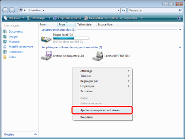 Cliquer avec le bouton droit de la souris sur [Ordinateur] dans l'Explorateur Windows, puis sélectionner [Ajouter un emplacement réseau].