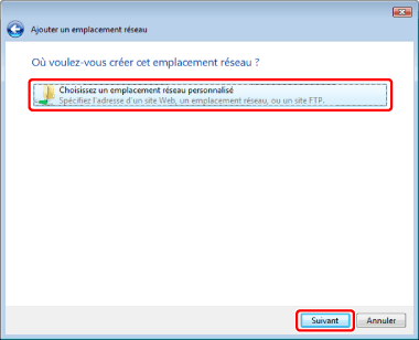 Sélectionner [Choisissez un emplacement réseau personnalisé], puis cliquer sur [Suivant].