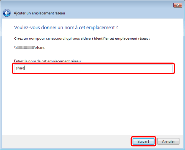 Saisir le nom du dossier de référence pour la connexion dans [Entrez le nom de cet emplacement réseau], puis cliquer sur [Suivant].