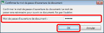 La boîte de dialogue [Confirmer le mot de passe d'ouverture de document] s'affiche lorsque la case [Demander un mot de passe pour ouvrir ce document] est sélectionnée.