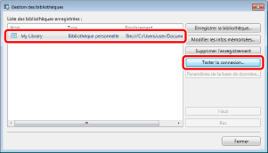 Sélectionnez une bibliothèque pour laquelle vous souhaitez tester la connexion, puis cliquez sur [Tester la connexion] dans la boîte de dialogue [Gestion des bibliothèques].