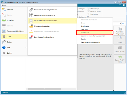 Sélectionnez le menu [Fichier] > [Outils] > [Créer un bouton de barre de sortie] > [Application].