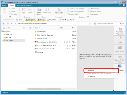 pour le bouton de sortie application affiché sur le ruban ou la barre d'outils et en sélectionnant [Modifier]. Si un bouton de sortie n'est pas affiché sur le ruban ou la barre d'outils, consulter les sections suivantes pour l'afficher. |