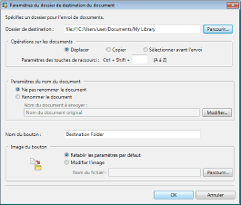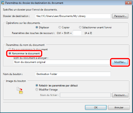 Si un bouton est renommé dans la boîte de dialogue [Paramètres du dossier de destination du document], le nom du bouton Dossier de destination du document affiché sur le ruban ou la barre d'outils est également modifié automatiquement.