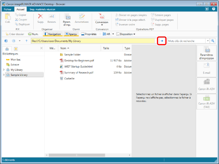 En cas d'accès à une bibliothèque ou à un dossier en saisissant le chemin directement dans la barre d'adresse, il est possible de sélectionner les dix dernières bibliothèques, dossiers ou documents affichés en cliquant sur