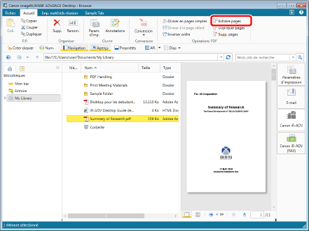Si plusieurs pages ont été sélectionnées avec l'affichage des miniatures, le document PDF extrait est enregistré avec la mention "_numéro de page de la première page sélectionnée" après le nom du document.