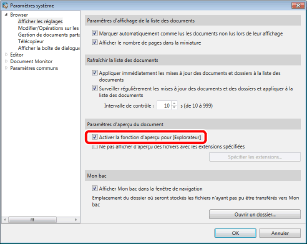 La fonction d'aperçu de Desktop Browser et la fonction d'aperçu de l'Explorateur Windows sont identiques. L'activation du paramètre de Desktop Browser pour prévisualiser des documents Office est indépendante du paramètre [Afficher les gestionnaires d’aperçu dans le volet de visualisation] dans les options des dossiers de l'Explorateur Windows. La prévisualisation est effectuée indépendamment pour chaque type de fichier et, bien que cela se produise rarement, il peut s'avérer impossible de prévisualiser des types de fichiers uniques. Dans ce cas, vérifier s'il est possible de prévisualiser le type de fichier dans l'Explorateur Windows.