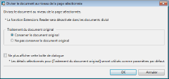 La boîte de dialogue [Diviser le document au niveau de la page sélectionnée] ne sera plus affichée. Le mode de traitement sélectionné dans [Traitement du document original] sera appliqué au document PDF d'origine.