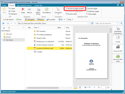 Menu [Fichier] > [Option] > [Paramètres système] > [Browser] > [Afficher la boîte de dialogue] > [Sélectionnez le traitement du document original lors de la division d'un document en pages simples]