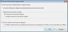 La boîte de dialogue [Diviser le document en pages simples] ne sera plus affichée. Le mode de traitement sélectionné dans [Traitement du document original] sera appliqué au document d'origine.