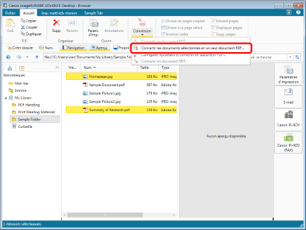 (Conversion) sur le ruban, puis sélectionner [Convertir les documents sélectionnés en un seul documen PDF].