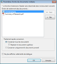 La boîte de dialogue [Paramètres d'ordre des documents multiples] s'affiche lorsque la case [Sélectionnez l'ordre de traitement des documents lors de la conversion des documents sélectionnés en un document PDF unique] est sélectionnée.