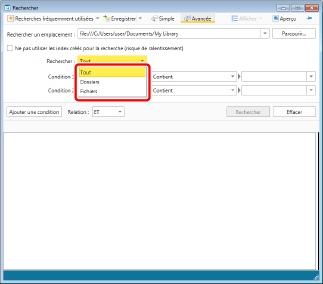 Effectue la recherche dans les dossiers. Si [Dossiers] est sélectionné, seules des propriétés de dossiers peuvent être sélectionnées dans les conditions de recherche.