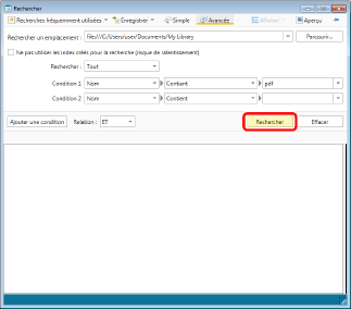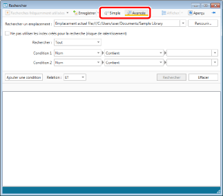 La case à cocher [Ne pas utiliser les index créés pour la recherche (risque de ralentissement)] s'affiche lorsqu'une Bibliothèque réseau (base de données) est sélectionnée comme cible de la recherche. Cocher cette case pour effectuer une recherche sans de base de données.