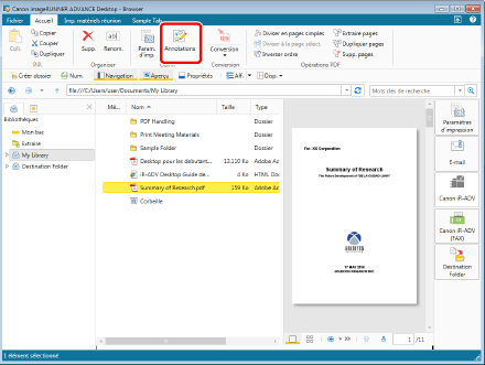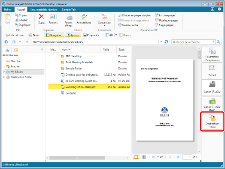 pour le Dossier de destination du document affiché sur le ruban ou la barre d'outils, puis sélectionner [Exécution].Si les boutons d'outil ne s'affichent pas sur la barre d'outils de Desktop Browser, voir la section suivante pour savoir comment les afficher.