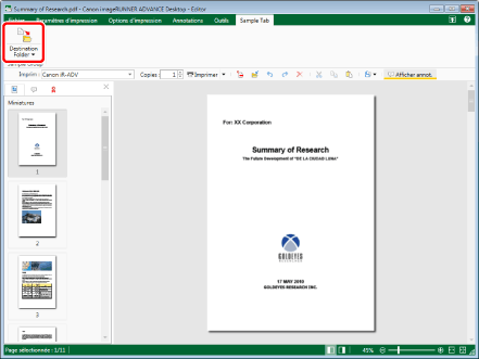 pour le Dossier de destination du document affiché sur le ruban ou la barre d'outils, puis sélectionner [Exécution].