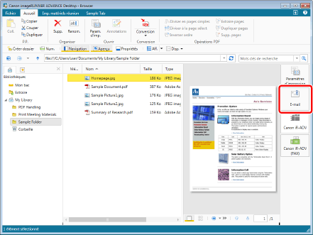 Il est également possible d'envoyer des documents en tant que fichiers d'application par courrier électronique. Pour plus d'informations, consulter la section suivante.